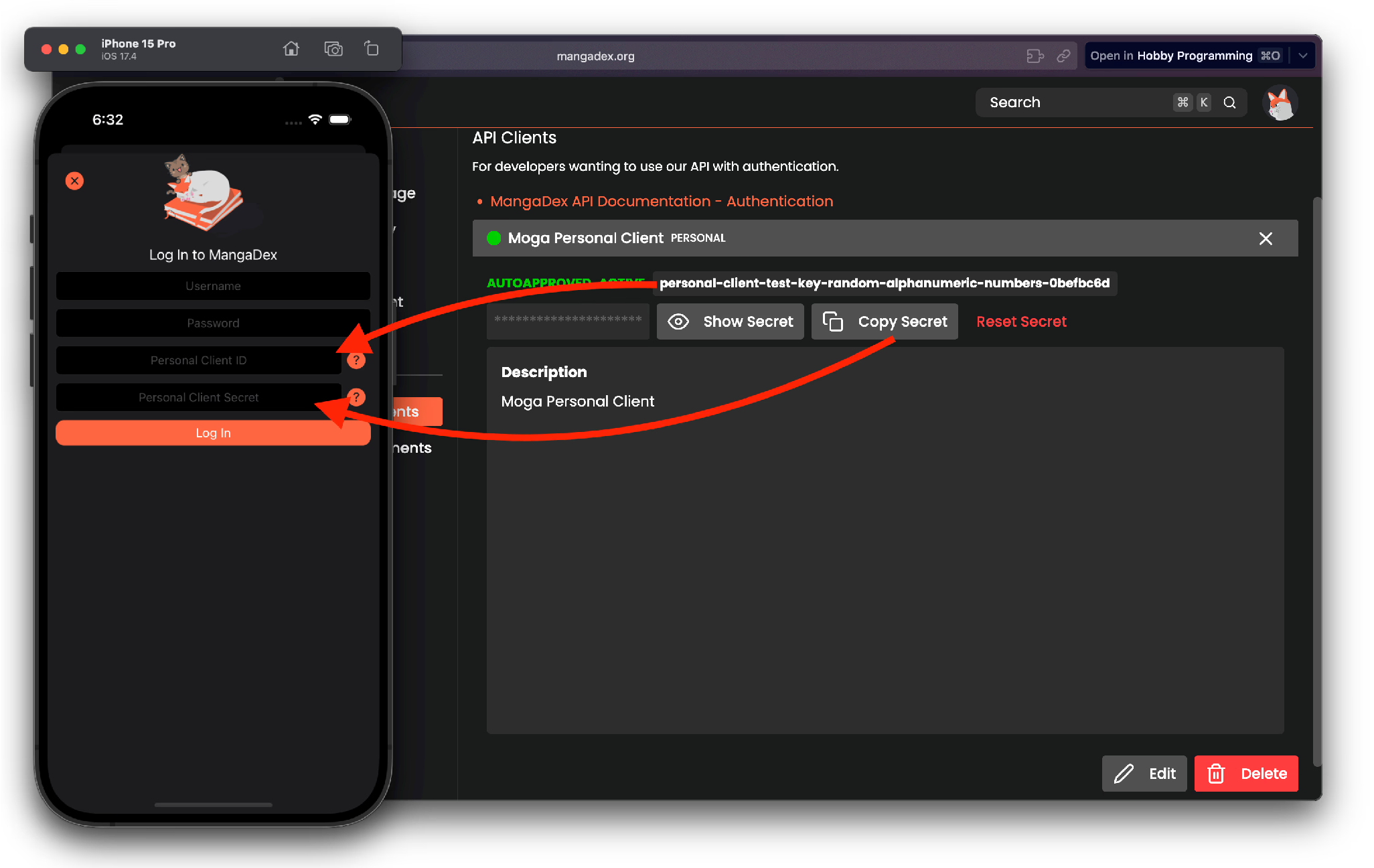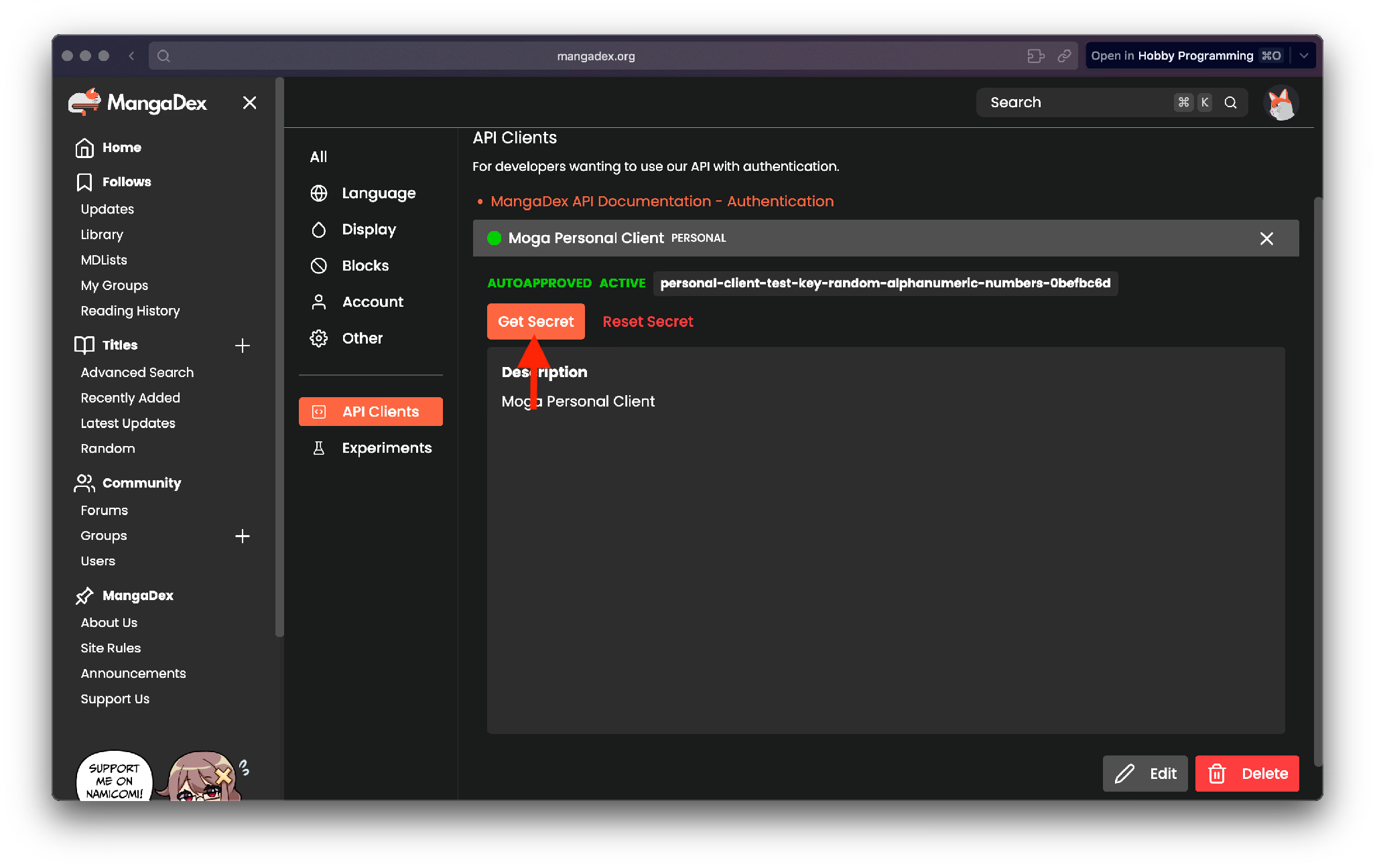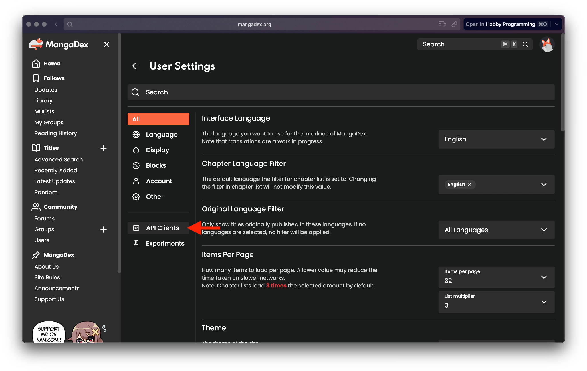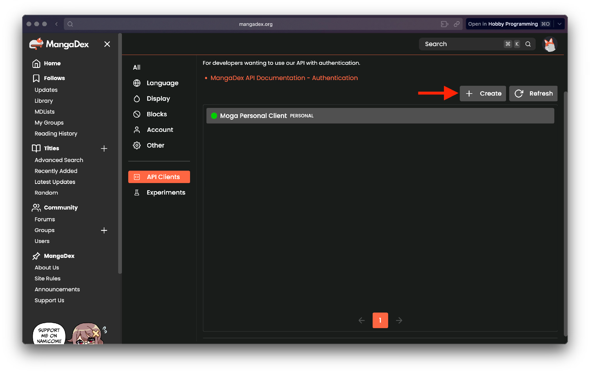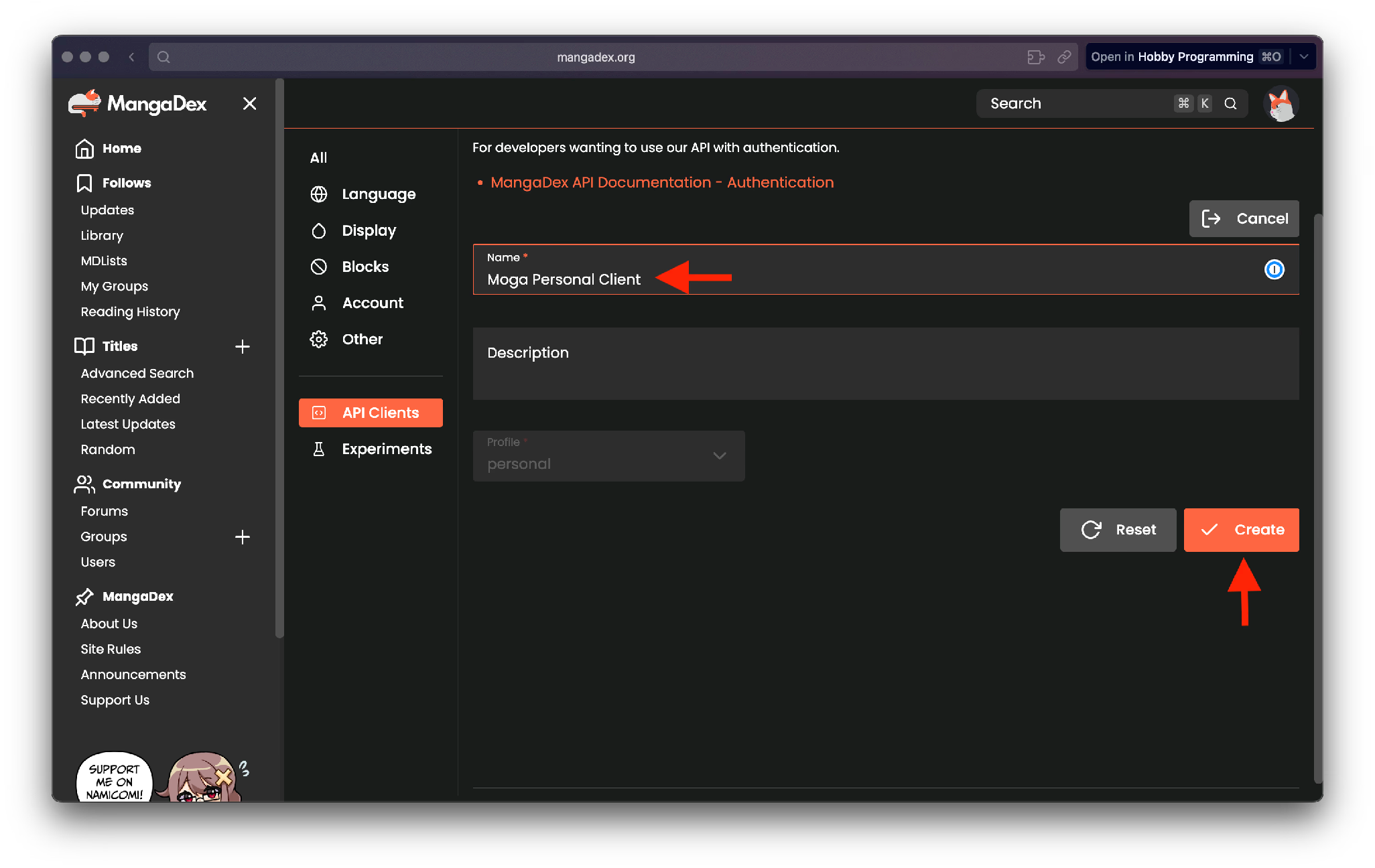 Moga will support logging into your MangaDex account with just your username and password when MangaDex launches that method. For now however, you will need to create a personal client for Moga to use. Please follow the instructions below if you wish to do so: